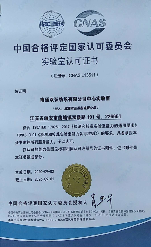 Son zamanlarda- Nantong Double Great Textile Co., Ltd.'nin Merkez Laboratuvarı, uygunluk değerlendirmesi için Çin Akreditasyon Servisi'nden başarıyla akreditasyon elde etti (CNA'lar) ve sertifika verildi. Bu, Laboratuvarın Çin Pamuk Tekstil Derneği'nin iplik test platformu haline geldikten sonra elde ettiği bir başka değerli yeterliliktir. Çift büyük şirketin merkezi laboratuvarı da ülkedeki olağanüstü pamuk eğirme işletmelerinin ileri laboratuvarlarından biri haline geldi.