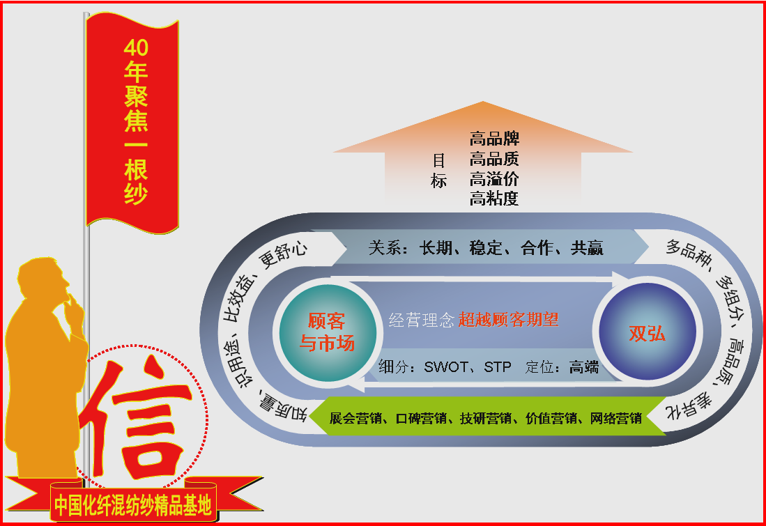 Müşterilere odaklanmak ve markaları iyileştirmek, çalışmalarında Yoldaş Ji Yijun'un kararlı gereksinimleri ve sağlam arayışlarıdır. Under his advocacy, the company has formulated the business philosophy of "using the rigorous management, spinning the quality yarn, and climbing the -end customers", with "high brand, high quality, high premium, and high stickiness" as the goal, using "SWOT, STP" and other tools to investigate and segment the market, lock in key customer groups, adopt a "small batch, multiple varieties, fast delivery, high quality" fast marketing strategy, implement "exhibition marketing, Ağızdan ağıza pazarlama, teknik araştırma pazarlaması, bilgi pazarlaması, değer pazarlaması, ağ pazarlama "ve diğer yöntemler ve müşterilerin kaliteyi bilmesini, amacı fark etmelerini, faydaları karşılaştırmasını, hızlı teslimatını ve daha rahat bir şekilde", "uzun vadeli, istikrarlı, işbirliği ve kazan-kazanma" müşteri ilişkisini oluşturma ve iki katlı büyük pazarlama modeli oluşturmak için "uzun vadeli, istikrarlı, hızlı teslimat ve daha rahat" makalelerini kullanın.