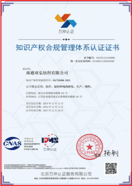 Fikri Mülkiyet Uyum Yönetim Sistemi Sertifikasyonu, bir üçüncü taraf sertifikasyon kuruluşunun, ilgili ulusal standartların veya teknik özelliklerin gerekliliklerine uyduğunu doğrulamak için bir işletmenin iç fikri mülkiyet yönetim sistemini değerlendirdiği bir uygunluk değerlendirme faaliyetidir. Şu anda, Double Great Company'nin 5 yerli tescilli ticari markası ve 2 Madrid International tescilli ticari markası bulunmaktadır. Çift büyük ticari marka Çin'de tanınmış bir ticari markadır; 50'den fazla Ulusal Buluş Patent ve Fayda Modeli Patentleri vardır ve Çin Tekstil Endüstrisi Patent Altın Ödülü'nü kazanır; 4 Ulusal Meşale ve 5 Spark Plan projesi üstlenmiştir; 3 ulusal standart, 11 endüstri standardı, 4 grup standardı ve 3 gümrük işleme ticaret birimi tüketim standardı oluşturmuştur; Endüstri-üniversite-araştırma gerçekleştirdi ve 5 temel teknoloji ve bilimsel ve teknolojik başarı projeleri, Çin tekstil endüstrisi bilimi ve teknoloji ilerlemesinin ikinci ödülünü kazandı.