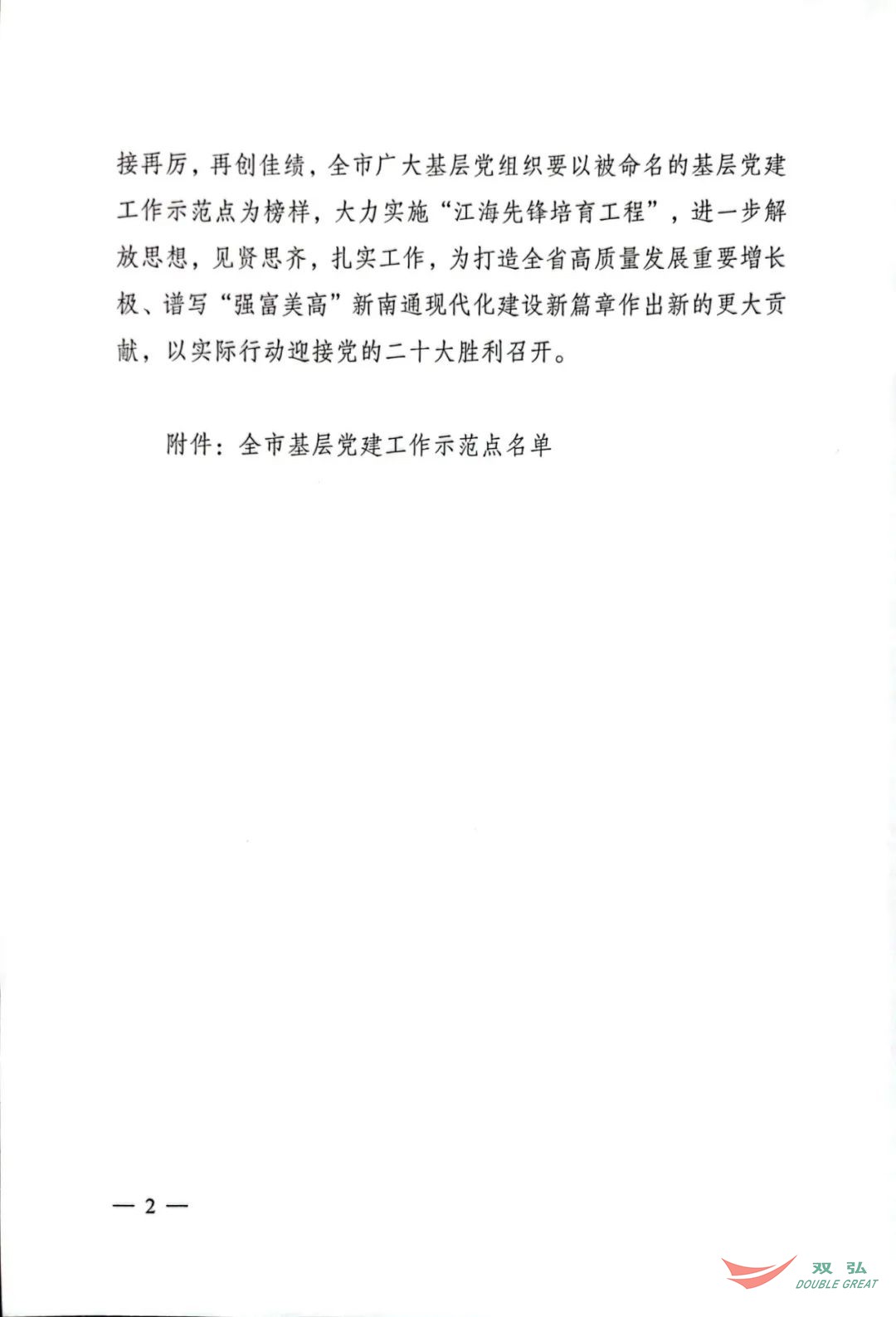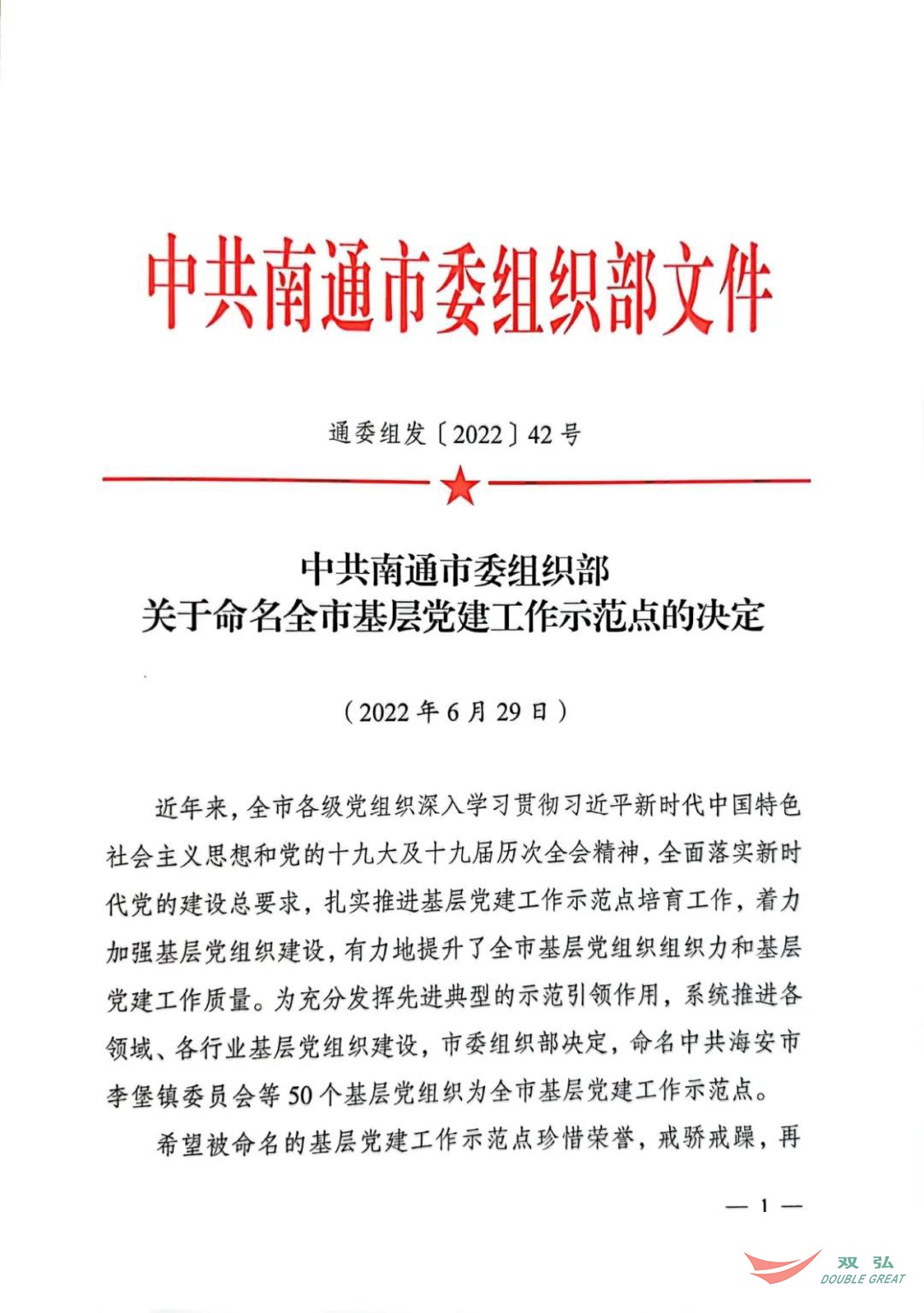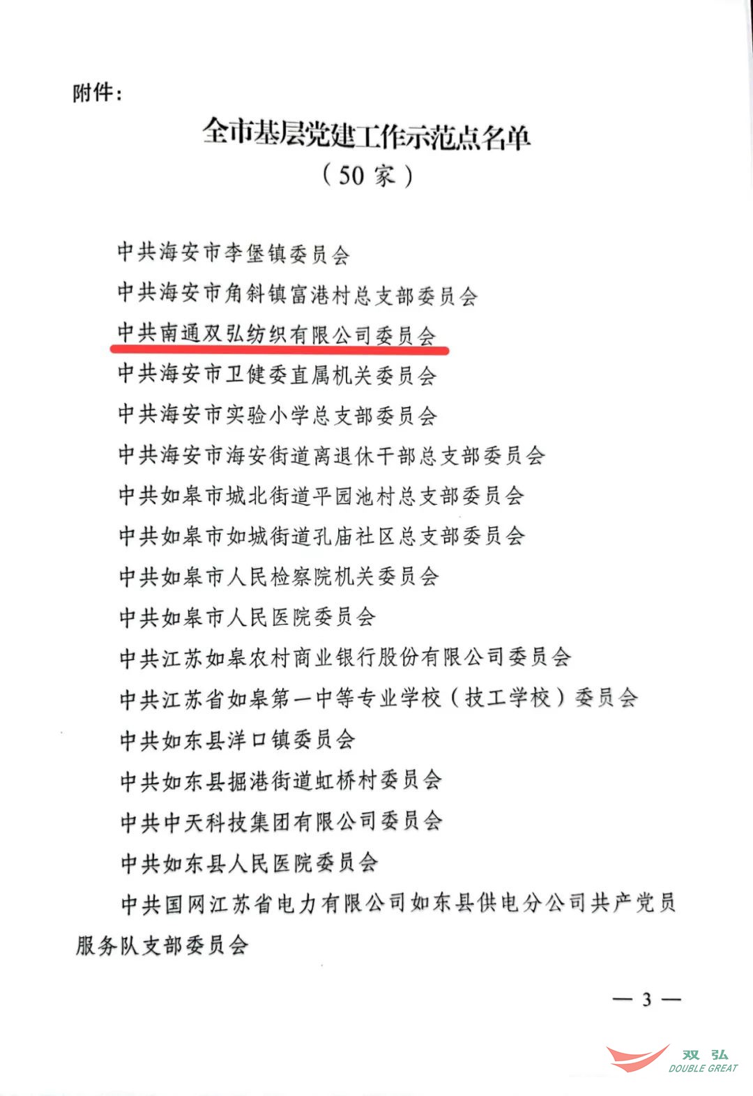 Son zamanlarda- TBM Nantong Belediye Komitesi Örgüt Bölümü, şehrin taban parti oluşturma gösterileri olarak 50 taban parti organizasyonunu adlandıran bir belge yayınladı. Nantong Double Great Textile Co., Ltd. Parti Komitesi "Şehrin taban parti bina gösteri sitesi" unvanını aldı.